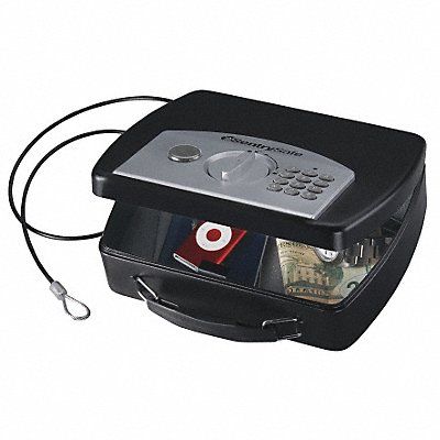 Portable Safe Color Black Net Weight 3 lb Capacity 0.08 cu ft Not Rated Fire Rating Water Endurance Not Specified Material Steel Finish Gloss Number of Shelves 0 Number of Drawers 0 Lock Style Electronic with Delay Mode Override Key Outside Height 3 in Outside Width 10 in Outside Depth 8 in Inside Height 1 7/8 in Inside Width 9 13/16 in Inside Depth 7 1/8 in Holds Cell Phones GPS Units iPods Wallets