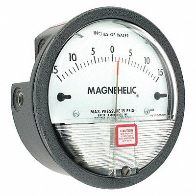 Differential Pressure Gauge Gauge Nominal Dial Size 3 1/2 in Basic Gauge Case Material Metal Differential Gauge Connection Type FNPT Differential Gauge Connection Size 1/8 in Gauge Connection Location Back and Side Differential Pressure Range Units in wc Differential Pressure Range Value -15 to 0 to 15 Gauge Accuracy +/-2.00 Percent Body Material Die Cast Aluminum Gauge Primary Range Smallest Graduation 1 Gauge Operating Temp Range 20 Degrees to 140 Degrees F