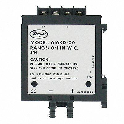 Differential Transmitter Output 4 to 20mA DC Minimum Pressure 0 in wc Maximum Pressure 15 in wc Overpressure 5 psig Accuracy +/-2 Percent of Full Scale Number of Wires 2 4 Process Connection Gender Male Process Connection Size 1/8 in 1/4 in Process Connection Type Hose Barb Power Required 10 to 35V DC (2 Wire) 12 to 26V AC (4 Wire) IP Rating IP20 NEMA Rating NEMA 1 Series 616KD Electrical Connections Screw Terminals Features Push-Button Sets Back Zero and Span