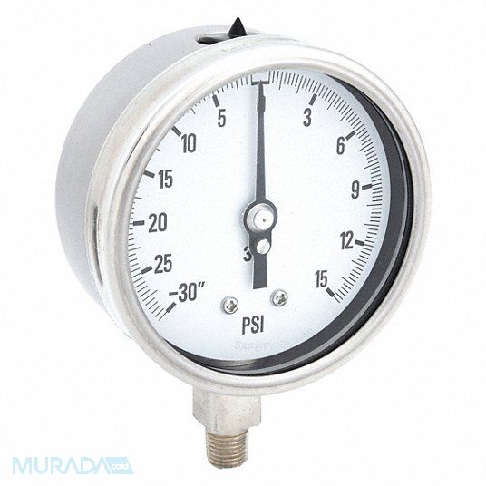 H8415 Industrial Compound Gauge Nominal Dial Size 4 in Accuracy +/-1.0 Percent Gauge Case Material Stainless Steel Process Connection Type NPT Process Connection Gender Male Lens Material Laminated Safety Glass Process Connection Size 1/4 in Field Fillable Yes Process Connection Location Bottom Case Color Metallic IP/NEMA Rating Not Rated Primary Pressure Range 30 to 0 to 15 Dry Dampening Feature None Vibration Resistance Field-Fillable Dial Color White