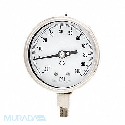 H8415 Industrial Compound Gauge Nominal Dial Size 4 in Accuracy +/-1.0 Percent Gauge Case Material Stainless Steel Process Connection Type NPT Process Connection Gender Male Lens Material Laminated Safety Glass Process Connection Size 1/4 in Field Fillable Yes Process Connection Location Bottom Case Color Metallic IP/NEMA Rating Not Rated Primary Pressure Range 30 to 0 to 100 Dry Dampening Feature None Vibration Resistance Field-Fillable Dial Color White