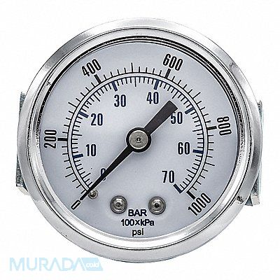 Industrial Pressure Gauge Nominal Dial Size 2 in Accuracy +/-3-2-3 Percent Gauge Case Material Stainless Steel Process Connection Type NPT Process Connection Gender Male Lens Material Plastic Process Connection Size 1/8 in Field Fillable No Process Connection Location Center Back Case Color Metallic IP/NEMA Rating Not Rated Primary Pressure Range 0 to 1 000 Dry Dampening Feature None Vibration Resistance None Dial Color White Pressure Gauge Type Panel-Mount Dial Pressure Gauge