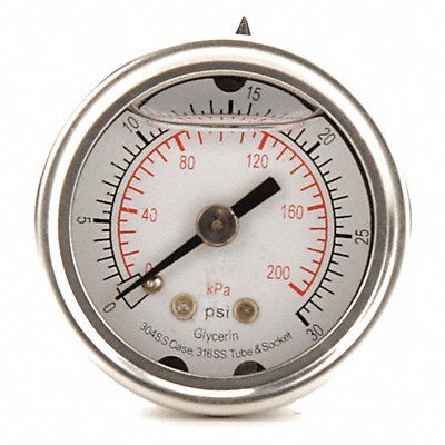 D1356 Commercial Pressure Gauge Nominal Dial Size 1 1/2 in Accuracy +/-3-2-3 Percent Gauge Case Material 304 Stainless Steel Process Connection Type NPT Process Connection Gender Male Lens Material Acrylic Process Connection Size 1/8 in Field Fillable No Process Connection Location Center Back Case Color Silver IP/NEMA Rating Not Rated Primary Pressure Range 0 to 30 Dry Dampening Feature None Vibration Resistance Liquid-Filled Dial Color White