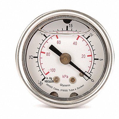 D1356 Commercial Pressure Gauge Nominal Dial Size 1 1/2 in Accuracy +/-3-2-3 Percent Gauge Case Material 304 Stainless Steel Process Connection Type NPT Process Connection Gender Male Lens Material Acrylic Process Connection Size 1/8 in Field Fillable No Process Connection Location Center Back Case Color Silver IP/NEMA Rating Not Rated Primary Pressure Range 0 to 60 Dry Dampening Feature None Vibration Resistance Liquid-Filled Dial Color White