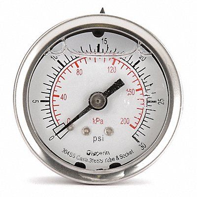D1361 Commercial Pressure Gauge Nominal Dial Size 2 in Accuracy +/-3-2-3 Percent Gauge Case Material 304 Stainless Steel Process Connection Type NPT Process Connection Gender Male Lens Material Acrylic Process Connection Size 1/4 in Field Fillable No Process Connection Location Center Back Case Color Silver IP/NEMA Rating Not Rated Primary Pressure Range 0 to 30 Dry Dampening Feature None Vibration Resistance Liquid-Filled Dial Color White