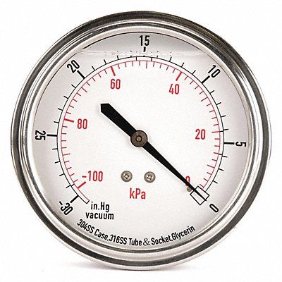 D1369 Commercial Vacuum Gauge Nominal Dial Size 3 1/2 in Accuracy +/-3-2-3 Percent Gauge Case Material 304 Stainless Steel Process Connection Type NPT Process Connection Gender Male Lens Material Acrylic Process Connection Size 1/4 in Field Fillable No Process Connection Location Center Back Case Color Silver IP/NEMA Rating Not Rated Primary Pressure Range 30 to 0 Dry Dampening Feature None Vibration Resistance Liquid-Filled Dial Color White