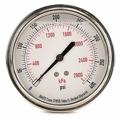 D1369 Commercial Pressure Gauge Nominal Dial Size 3 1/2 in Accuracy +/-3-2-3 Percent Gauge Case Material 304 Stainless Steel Process Connection Type NPT Process Connection Gender Male Lens Material Acrylic Process Connection Size 1/4 in Field Fillable No Process Connection Location Center Back Case Color Silver IP/NEMA Rating Not Rated Primary Pressure Range 0 to 400 Dry Dampening Feature None Vibration Resistance Liquid-Filled Dial Color White