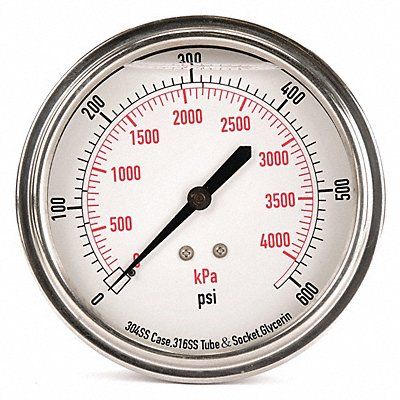 D1369 Commercial Pressure Gauge Nominal Dial Size 3 1/2 in Accuracy +/-3-2-3 Percent Gauge Case Material 304 Stainless Steel Process Connection Type NPT Process Connection Gender Male Lens Material Acrylic Process Connection Size 1/4 in Field Fillable No Process Connection Location Center Back Case Color Silver IP/NEMA Rating Not Rated Primary Pressure Range 0 to 600 Dry Dampening Feature None Vibration Resistance Liquid-Filled Dial Color White