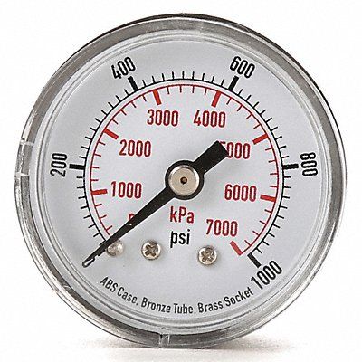Commercial Pressure Gauge Nominal Dial Size 1 1/2 in Accuracy +/-3-2-3 Percent Gauge Case Material ABS Plastic Process Connection Type BSPT Lens Material Polycarbonate Process Connection Size 1/8 in Field Fillable No Process Connection Location Center Back Case Color Black IP/NEMA Rating Not Rated Primary Pressure Range 0 to 1 000 Dry Dampening Feature None Vibration Resistance None Dial Color White Pressure Gauge Type General Purpose Dial Pressure Gauge Liquid-Filled Case No