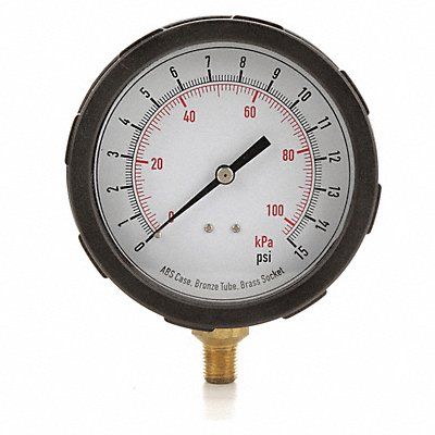 D1382 Industrial Pressure Gauge Nominal Dial Size 4 in Accuracy +/-2-1-2 Percent Gauge Case Material ABS Plastic Process Connection Type NPT Process Connection Gender Male Lens Material Polycarbonate Process Connection Size 1/4 in Field Fillable No Process Connection Location Bottom Case Color Black IP/NEMA Rating Not Rated Primary Pressure Range 0 to 15 Dry Dampening Feature None Vibration Resistance None Dial Color White Pressure Gauge Type Industrial Pressure Gauge