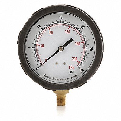 D1382 Industrial Pressure Gauge Nominal Dial Size 4 in Accuracy +/-2-1-2 Percent Gauge Case Material ABS Plastic Process Connection Type NPT Process Connection Gender Male Lens Material Polycarbonate Process Connection Size 1/4 in Field Fillable No Process Connection Location Bottom Case Color Black IP/NEMA Rating Not Rated Primary Pressure Range 0 to 30 Dry Dampening Feature None Vibration Resistance None Dial Color White Pressure Gauge Type Industrial Pressure Gauge