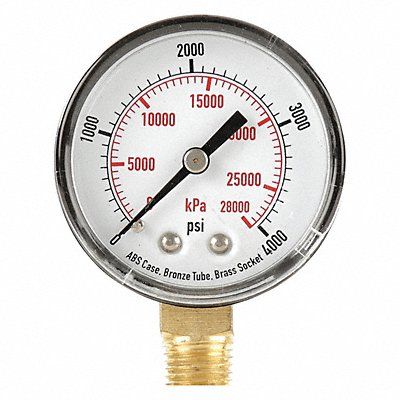 D1338 Commercial Pressure Gauge Nominal Dial Size 2 in Accuracy +/-3-2-3 Percent Gauge Case Material ABS Plastic Process Connection Type NPT Process Connection Gender Male Lens Material Acrylic Process Connection Size 1/4 in Field Fillable No Process Connection Location Bottom Case Color Black IP/NEMA Rating Not Rated Primary Pressure Range 0 to 4 000 Dry Dampening Feature None Vibration Resistance None Dial Color White Pressure Gauge Type General Purpose Dial Pressure Gauge