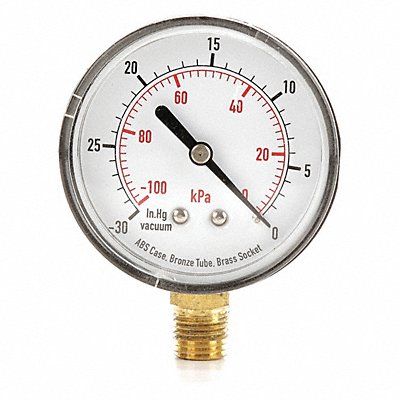 D1343 Commercial Vacuum Gauge Nominal Dial Size 2 1/2 in Accuracy +/-3-2-3 Percent Gauge Case Material ABS Plastic Process Connection Type NPT Process Connection Gender Male Lens Material Acrylic Process Connection Size 1/4 in Field Fillable No Process Connection Location Bottom Case Color Black IP/NEMA Rating Not Rated Primary Pressure Range 30 to 0 Dry Dampening Feature None Vibration Resistance None Dial Color White Pressure Gauge Type General Purpose Dial Pressure Gauge