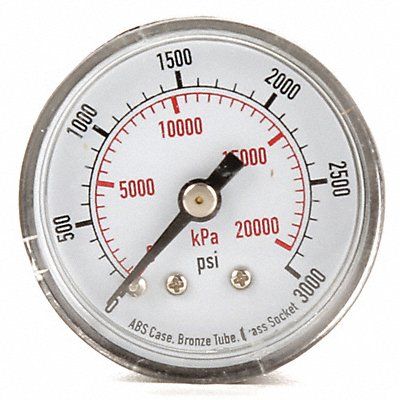 D1335 Commercial Pressure Gauge Nominal Dial Size 1 1/2 in Accuracy +/-3-2-3 Percent Gauge Case Material ABS Plastic Process Connection Type NPT Process Connection Gender Male Lens Material Acrylic Process Connection Size 1/8 in Field Fillable No Process Connection Location Center Back Case Color Black IP/NEMA Rating Not Rated Primary Pressure Range 0 to 3 000 Dry Dampening Feature None Vibration Resistance None Dial Color White Pressure Gauge Type General Purpose Dial Pressure Gauge