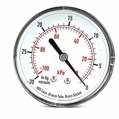 D1344 Commercial Vacuum Gauge Nominal Dial Size 2 1/2 in Accuracy +/-3-2-3 Percent Gauge Case Material ABS Plastic Process Connection Type NPT Process Connection Gender Male Lens Material Acrylic Process Connection Size 1/4 in Field Fillable No Process Connection Location Center Back Case Color Black IP/NEMA Rating Not Rated Primary Pressure Range 30 to 0 Dry Dampening Feature None Vibration Resistance None Dial Color White Pressure Gauge Type General Purpose Dial Pressure Gauge