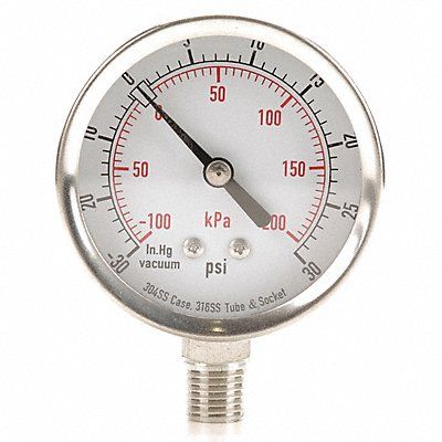 D1362 Commercial Compound Gauge Nominal Dial Size 2 1/2 in Accuracy +/-3-2-3 Percent Gauge Case Material 304 Stainless Steel Process Connection Type NPT Process Connection Gender Male Lens Material Acrylic Process Connection Size 1/4 in Field Fillable No Process Connection Location Bottom Case Color Silver IP/NEMA Rating Not Rated Primary Pressure Range 30 to 0 to 30 Dry Dampening Feature None Vibration Resistance None Dial Color White