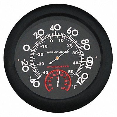 Analog Thermometer/Hygrometer Scale Type Dial -40 Degrees to 120 Degrees F/-40 Degrees to 50 Degrees C Primary Scale Temperature Dial Design White/Red Scale on Black Dial Case Material ABS Plastic Graduations 2 Degrees F/2 Degrees C/2 Percent RH Humidity Range 0 Percent to 100 Percent Wall-Mount 10 in dia