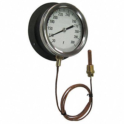 G2671 Analog Panel Mount Thermometer 30 Degrees to 180 Degrees F 4.5 in 0.4 in Dia x 2 in L Copper Probe Probe Length 2 in 1/2 in MNPT with 10 ft Cable Vapor-Actuated Aluminium Housing with Glass Lens Cable Length 10 ft