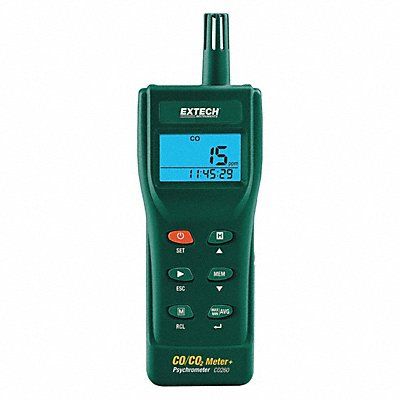 Carbon Monoxide/Carbon Dioxide IAQ Meter Carbon Monoxide Measurement Range (PPM) 0 to 999 Carbon Dioxide Concentration 0 to 9999 ppm Temp Range -5 Degrees to 140 Degrees F Relative Humidity Range 0 to 99.9 Percent Dew Point Range -5 Degrees to 140 Degrees F Wet Bulb Temperature Range -5 to 140 Degrees F Humidity Accuracy +/-3 Percent Accuracy +/-10 Percent Resolution 0.1 Percent Display Triple LCD Auto Power Off Yes Low Battery Indicator Yes Data Hold Yes