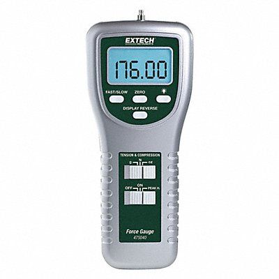 Digital Force Gauge Range 176 oz/5000 gm/49 N Resolution 0.05 oz/1 g/0.01 N Accuracy +/-0.4 Percent + 1 Digit Measure Tension (Pull) Compression (Push) on Springs Belts or any Mechanical Mechanism Display 5 Digit LCD Interface - Includes Flat Cone Chisel Compression Tips Tension Hook Tip 5 in Extension Rod 6 AA Batteries Carrying Case and Instructions Manufacturers Warranty Length 1 yr
