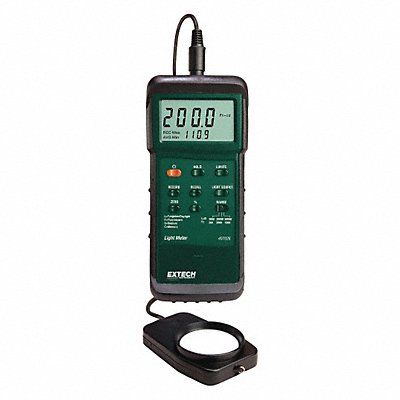 Light Meter Tungsten/Daylight Fluorescent Sodium Mercury Lighting Types Measuring Range 0 to 200 0 to 2000 0 to 5000 FC 0 to 2000 0 to 20 000 0 to 50 000 Lux Resolution 0.1/1/10 FC 1/10/100 Lux Accuracy +/-4 Percent + 2 Digits FS Display 1.4 in Digit (1999 Count) LCD Data Hold Yes Min./Max. Memory Yes Interface Built-in RS-232 Auto Power Off Yes 9V Battery Type Selenium Photovoltaic Sensor Cord Length 45 in No Calibration Certificate