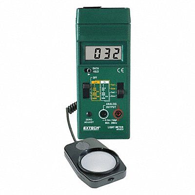 Light Meter Fluorescent Halogen Lamps High Pressure Sodium Incandescent Metal Halide White/Red/Yellow/Green/Blue LED Lighting Types Measuring Range 0 to 50 000 Lux 0 to 5000 FC Resolution 0.1 FC or 1Lux Accuracy +/-5 Percent Display LCD Peak Hold No Data Hold Yes Min./Max. Memory No Data Logging No Interface No Auto Power Off No 9V Battery Type Color Cosine Correction Sensor NIST Calibration Certificate