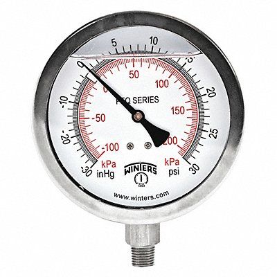 Industrial Compound Gauge Nominal Dial Size 4 in Accuracy +/-1.5 Percent Gauge Case Material 304 Stainless Steel Process Connection Type NPT Process Connection Gender Male Lens Material Polycarbonate Process Connection Size 1/4 in Field Fillable Yes Process Connection Location Bottom Case Color Metallic IP/NEMA Rating IP65 Primary Pressure Range 30 to 0 to 30 Dry Dampening Feature None Vibration Resistance Field-Fillable Dial Color White