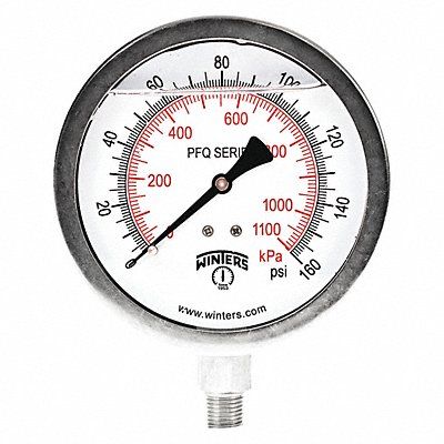 Industrial Pressure Gauge Nominal Dial Size 4 in Accuracy +/-1.5 Percent Gauge Case Material 304 Stainless Steel Process Connection Type NPT Process Connection Gender Male Lens Material Polycarbonate Process Connection Size 1/4 in Field Fillable Yes Process Connection Location Bottom Case Color Metallic IP/NEMA Rating IP65 Primary Pressure Range 0 to 160 Dry Dampening Feature None Vibration Resistance Field-Fillable Dial Color White