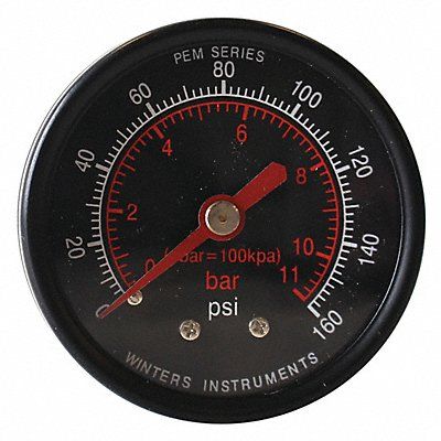 Commercial Pressure Gauge Nominal Dial Size 2 in Accuracy +/-3-2-3 Percent Gauge Case Material Steel Process Connection Type NPT Process Connection Gender Male Lens Material Acrylic Process Connection Size 1/8 in Field Fillable No Process Connection Location Center Back Case Color Black IP/NEMA Rating IP52 Primary Pressure Range 0 to 160 Dry Dampening Feature None Vibration Resistance None Dial Color Black Pressure Gauge Type General Purpose Dial Pressure Gauge