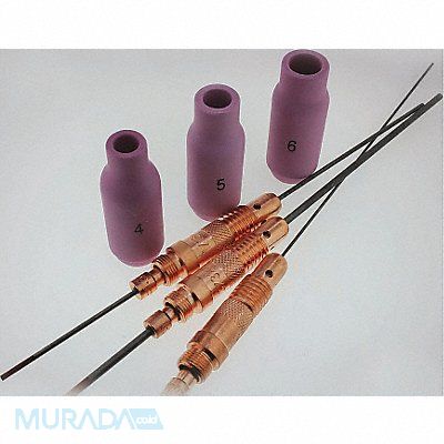Accessory Kit Includes 1 Long Back Cap (3) Collets 1/16 3/32 1/8 in (3) Collet Bodies 1/16 3/32 1/8 in (3) Alumina Nozzles #5 6 7 (3) 7 in Tungsten 1/16 3/32 1/8 in