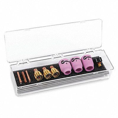 Water-Cooled Tig Torch Consumable Kit Type TIG Includes (1) Back Cap (3) 7 in Tungsted Electrode 1/8 in (3) Alumina Gas Lens 1/8 in (3) Collet 1/8 in (3) Gas Nozzle #6 #7 #8 1/16 in 3/32 in