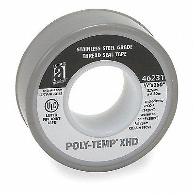 Thread Sealant Tape Specific Sealing Application For Stainless Steel Thread Sealing Series POLY-TEMP(R) SSG (XHD) Overall Width 1/2 in Overall Length 21 ft Minimum Operating Temperature -400 Degrees F Maximum Operating Temperature 550 Degrees F Maximum Operating Pressure for Liquids 10 000 psi Maximum Operating Pressure for Gases 2 000 psi Maximum Linear Density 1.5 g/cc Minimum Linear Density 1.2 g/cc Color Gray Tape Type Pipe Thread Sealant Tape For Maximum Thread Diameter 1/2 in