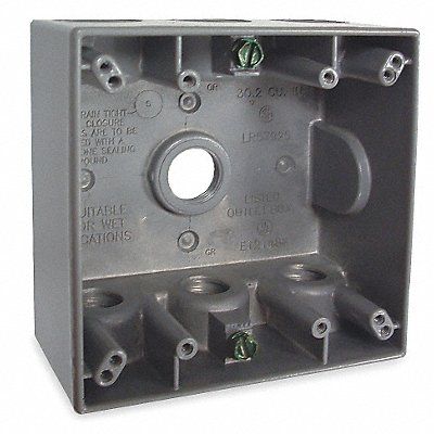 Weatherproof Electrical Box Number of Gangs 2 Number of Inlets 7 Length 4.56 in Width 4.56 in Depth 2 in Hub Size 1/2 in Color Gray Box Type Double Gang Capacity 30.2 cu in Description/Special Features Standard Material Aluminum Standards CSA UL