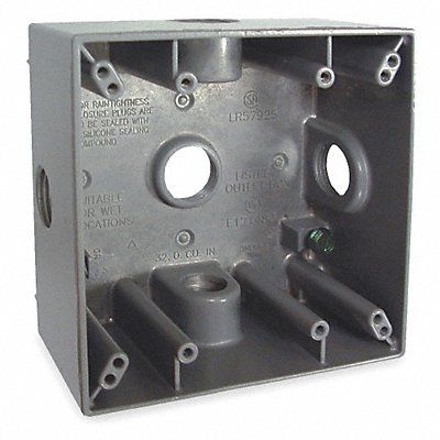 Weatherproof Electrical Box Number of Gangs 2 Number of Inlets 5 Length 4.56 in Width 4.56 in Depth 2 in Hub Size 3/4 in Color Gray Box Type Double Gang Capacity 32 cu in Description/Special Features Standard Material Aluminum Standards CSA UL