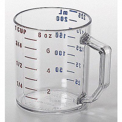 Polycarbonate Measuring Cup Capacity 1 cup Material Polycarbonate Length 3 1/2 in Width 2 3/4 in Height 3 1/8 in Color Clear Handle Type Molded Handle Color Clear Standards NSF Package Quantity 12