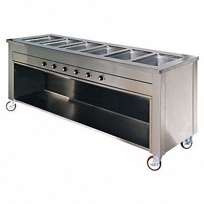 Hot Food Table 4-Well Length 63 in Depth 30 in Height 36 in Holds 4 Full Size Pans Material Stainless Steel 4000 @ 208 4800 @ 240 Watts Voltage 208 or 240 Phase Single 10.2 @ 208 20 @ 240 Amps Color Silver Caster Type HD Non-Marking Swivel Caster Material Thermoplastic Elastomer Includes Enclosed Sides and Bottom Shelf