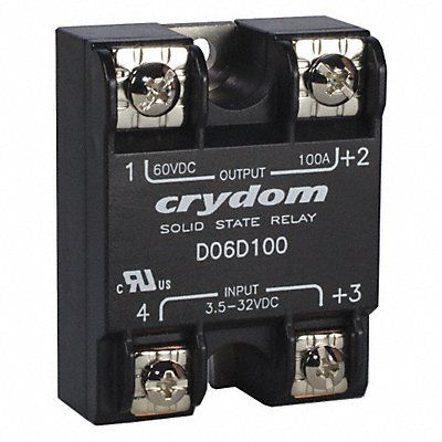 Solid State Relay Electrical Connection Screw Clamp Heat Sink Not Included Input Current 15 mA Input Voltage 3.5 to 32V DC Maximum Output Current with Heat Sink 60 A Maximum Output Current without Heat Sink Not Recommended Output Switching Mode Not Applicable Output Voltage Range 1 to 48V DC Standards CE Compliant to EN60950-1 EMC Compliant to Level 3 UL Listed Switch Component Type MOSFET Current Type DC Finger Safe No Mounting Style Panel Switch Configuration Form A