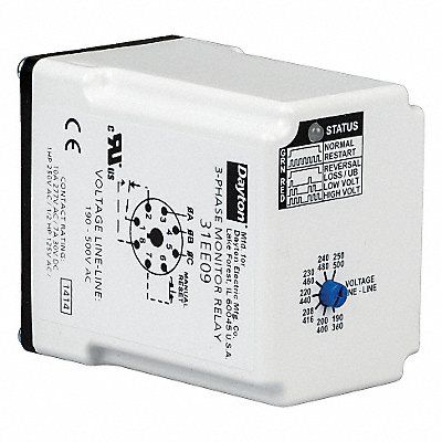 Phase Monitor Relay Base Shape Octal Contact Form SPDT Contact Rating (AC) 10 A @ 277V Contact Rating (DC) 7 A @ 30V Current Rating 10 A Input Voltage 190 to 500V AC Monitored Parameters Overvoltage Phase Loss Phase Reversal Phase Unbalance Undervoltage Number of Pins 8 Restart Auto Manual Restart Time Delay 2 sec Mounting Style Plug-In Body Depth 2.4 in Body Height 2.9 in Body Width 1.7 in Compatible with Grainger Part Number 5X852