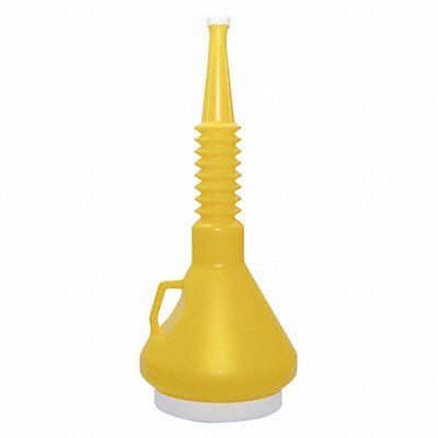 Spout Funnel Material Polyethylene Fluid Capacity 48 fl oz Overall Diameter 4 in Overall Height 14 1/4 in Spout Outside Diameter 3/4 in Spout Length 9 in Color Yellow Spout Yes Cover Yes Flow Capacity 48 oz Mouth Shape Round