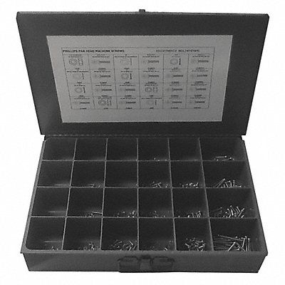 Fastener Assortment Finish Zinc Plated Head Type Pan Drive Phillips Number of Sizes 24 Number of Pieces 1 200 Material Steel Pack Size Small System of Measurement Inch Container Material Metal Head Style Pan Hex Nuts Included #10-32 #6-32 #8-32