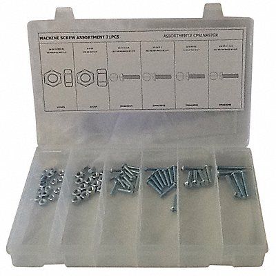 Machine Screw Assortment Finish Zinc Plated Head Type Round Drive Slotted Number of Sizes 6 Number of Pieces 71 Material Steel Pack Size Small System of Measurement Inch Container Material Plastic Head Style Round Hex Nuts Included (15) 1/4 in -20 (24) #10-24 Includes Screws (12) Each 10-24 x 3/4 in (10) Each 10-24 x 1 in (5) Each 1/4 In.-20 x 1 in x1 1/2 in Hex Nuts (24) Each 10-24 (15) Each 1/4 In.-20 Plastic Hanging Pak Includes Flat Washers No