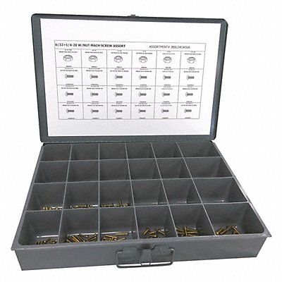 Nut and Screw Assortment Finish Plain Head Type Round Drive Slotted Number of Sizes 24 Number of Pieces 600 Material Brass Pack Size Small System of Measurement Inch Container Material Metal Head Style Round Hex Nuts Included #10-24 #10-32 #12-24 #6-32 #8-32 1/4 in-20