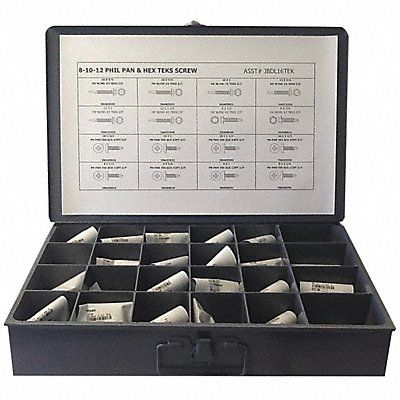Teks Screw Assortment Finish Zinc Plated Head Type Hex Washer Drive External Hex Number of Sizes 16 Number of Pieces 800 Material Steel Pack Size Small System of Measurement Inch Container Material Metal Head Style Hex Hex Head Screws Included (50) #2 Point 8 x 1/2 in #3 Point 10 x 5/8 in 10 x 1 in 12 x 1 1/2 in 12 x 3/4 in 8 x 3/4 in