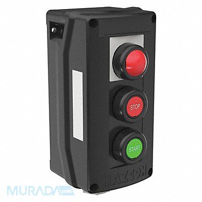 Control Station Number of Gangs 1 Number of Operators 3 Number of Pilot Lights 1 Contact Rating 20A Hub Style Dead-End Hub Size 3/4 in Type of Operator Push Button/Push Button Action Momentary/Momentary Contact Form 1NO/1NC 1NO/1NC Series HKH Operator Color Green/Red NEMA Contact Rating Designation A600/P600 NEMA Rating 12 13 3 4 4X IP Rating 66 Mounting Surface Height 7.0 in Width 3.79 in Depth 3.63 in Enclosure Material Impact Resistant Non-Metallic
