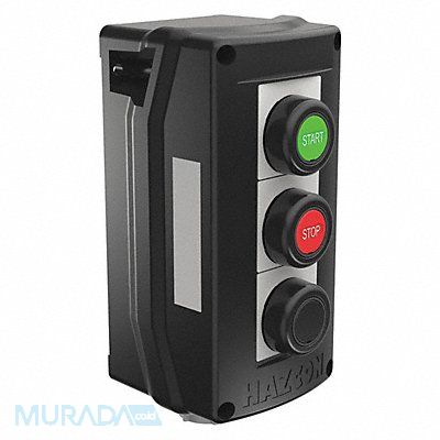 Control Station Number of Gangs 1 Number of Operators 3 Number of Pilot Lights 0 Contact Rating 20A Hub Style Dead-End Hub Size 3/4 in Type of Operator Flush Button/Flush Button/Flush Button Action Momentary/Momentary/Momentary Contact Form 1NO/1NC 1NO/1NC 1NO/1NC Series HKH Operator Color Black/Green/Red NEMA Contact Rating Designation A600/P600 HP 1/2 hp NEMA Rating 12 13 3 4 4X IP Rating 66 Mounting Surface Height 8.65 in Width 3.79 in Depth 3.63 in