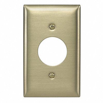 Single Receptacle Wall Plate Color Brass Material Brass Number of Gangs 1 Plate Size Standard Resistance Properties Impact Resistant Circular Outlet Diameter 1.4 in Finish Brushed Number of Outlet Openings 1 Number of Switch Openings 0 Outlet Orientation Vertical Overall Height 0.1 in Standards UL Listed Wall Plate Type Single Circular Opening Features Protective Film Helps to Prevent Scratches and Damage