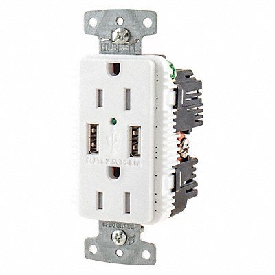 USB Charger Receptacle Current Rating 15 A Electrical Connection Type Straight Blade Housing Color White Number of Outlets 2 Number of USB Ports 2 Number of Wires 3 Power Indicating Light Yes Receptacle Type Duplex Resistance Properties Tamper Resistant USB Connection Type A Voltage Rating 125V AC Wire Connection Type Screw Terminals Wiring Method Back Side Grounding Grounded Horsepower Rating 1/2 hp Housing Material RTP Maximum Wire Size 10 AWG Minimum Wire Size 14 AWG