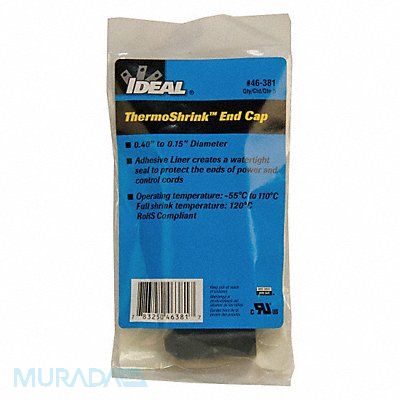 Dual Wall End Cap I.D. Before Shrinking 0.55 in I.D. After Shrinking 0.18 in Temp Range -55 Degrees to 110 Degrees F Shrink Ratio 3 1 Length 1.75 in Medium Wall Use With Wire Size 12 AWG to 6 AWG Wall Thickness After Shrinking 0.079 in Material Cross-Linked Polyolefin with Adhesive Shrink Tubing Properties UV Light Resistant Flame Retardant No Color Black Adhesive Lined Yes Application General Dielectric Strength 1 000 V Min Shrink Temp 248 Degrees F