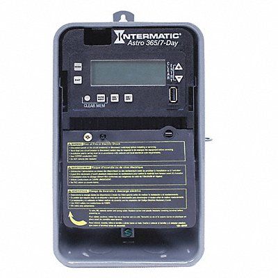 Electronic Timer Operation Mode Astro 7/365 Days Number of Channels 2 Contact Form SPST Voltage 120 to 277V AC Amps 30 A HP @ 120V 1 HP @ 240V 2 Events Available - Electronic Timer 96 Available Actions - Electronic Timer On/Off Pulse Event Allocation - Electronic Timer 1 On/Off Action = 2 Events 1 Pulse Action = 1 Event Pulse Duration 2 sec Enclosure Metal Mounting Surface Number of Poles 2 Min Time Setting 1 min Max Time Setting 7 day NEMA Rating 3R Color Gray