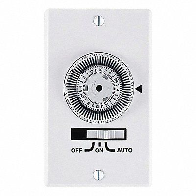 Wall Switch Timer Min Time Setting 20 min Max Time Setting 45 min 23 hr Max On/Off Cycles 36 Voltage 120V AC Watts 2500 Amps 20 1-Pole HP @ 120V 1 hp Type of Switch Electromechanical Color White Length 4 19/32 in Width 3 19/64 in Style Wall Switch Depth 3 19/64 in Number of Gangs 1 Standards cRUus CSA cULus